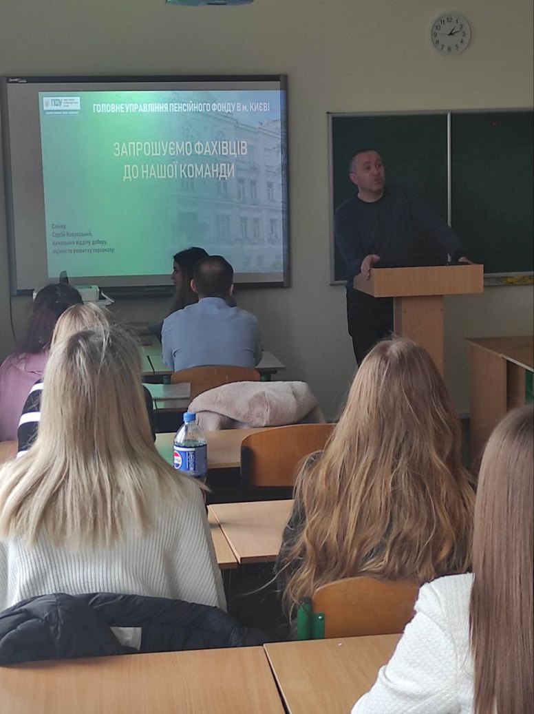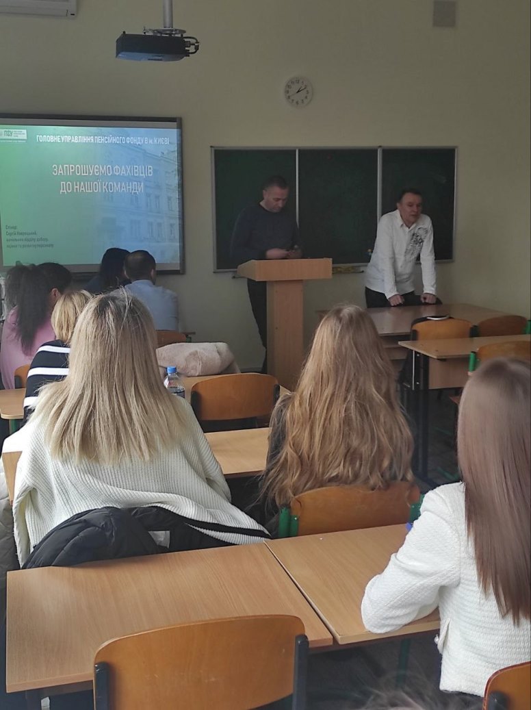 19 березня 2024 року в Фаховому коледжі «Універсум» відбулася зустріч студентів 2 та 4 курсу спеціальності «Право» з начальником управління по роботі з персоналом Головного управління Пенсійного фонду в м. Києві – Навроцьким Сергієм Васильовичем та з представниками інших підрозділів Пенсійного фонду. Студенти ознайомились з особливостями роботи Пенсійного фонду, перспективами працевлаштування та професійного зростання.