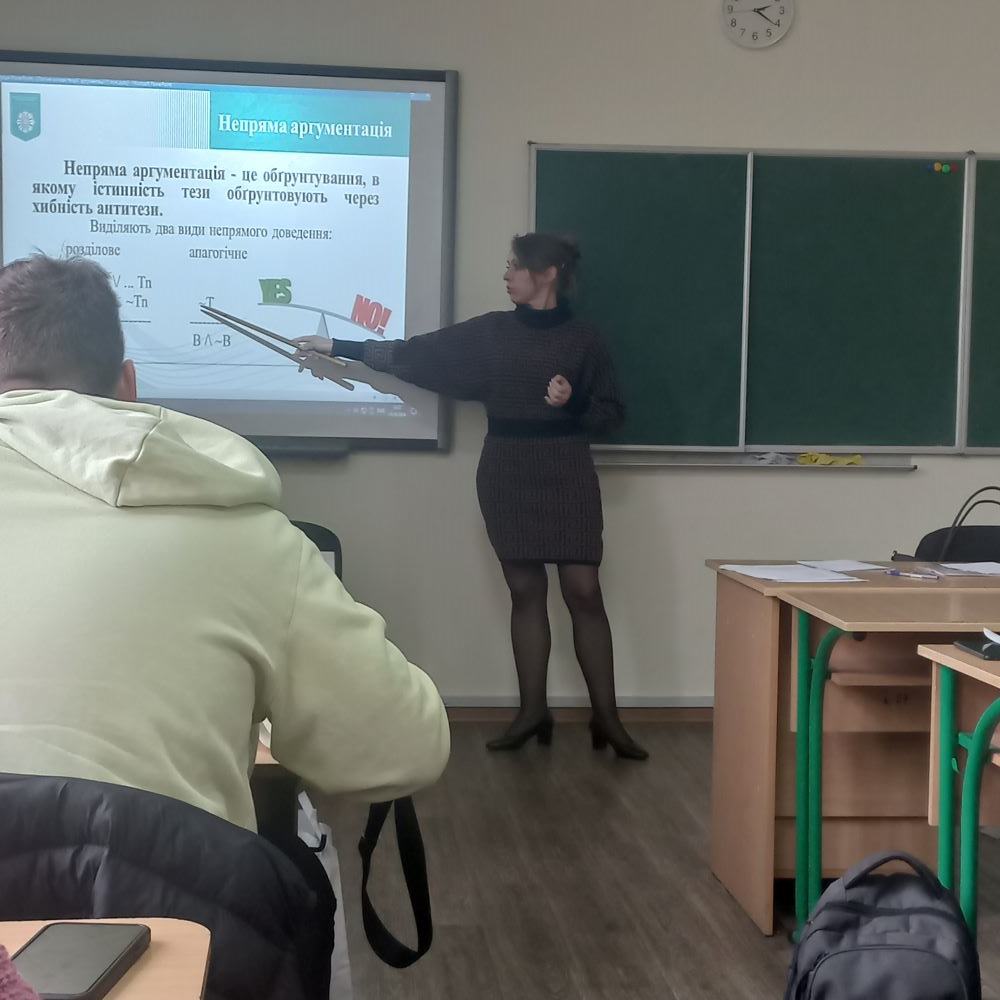 23 жовтня 2024 року в Фаховому коледжі "Універсум" Київського столичного університету імені Бориса Грінченка викладачем циклової комісії суспільних дисциплін і правознавства Ларисою ЛІМ у групі 3 курсу спеціальності "Право" було проведено відкрите заняття з дисципліни "Логіка" на тему: "Логічні основи теорії аргументації"