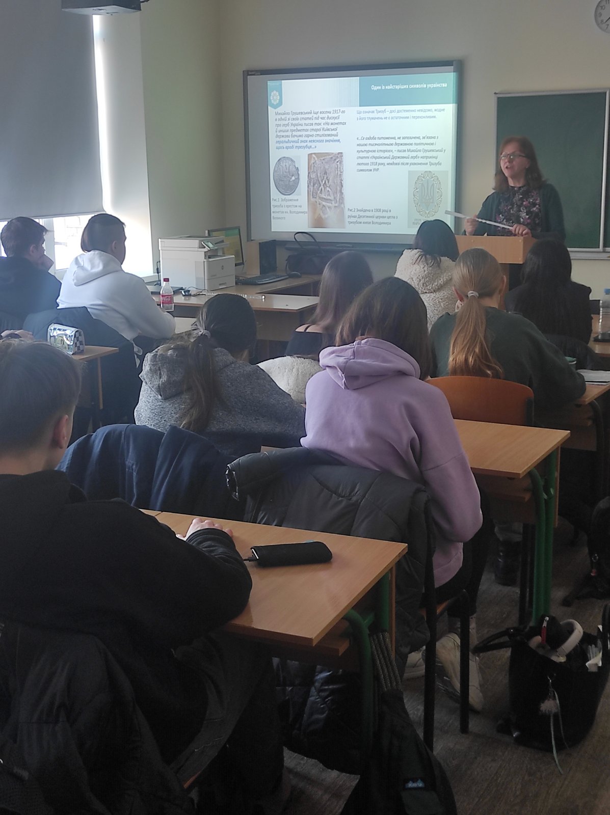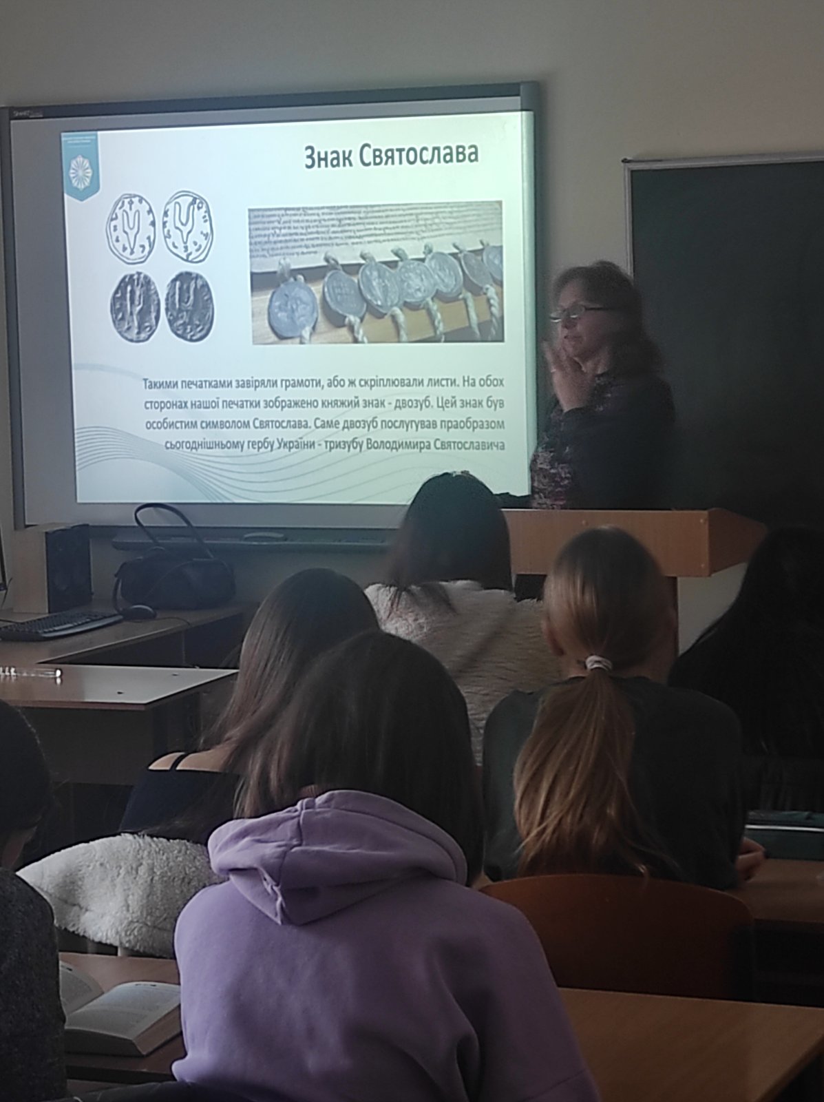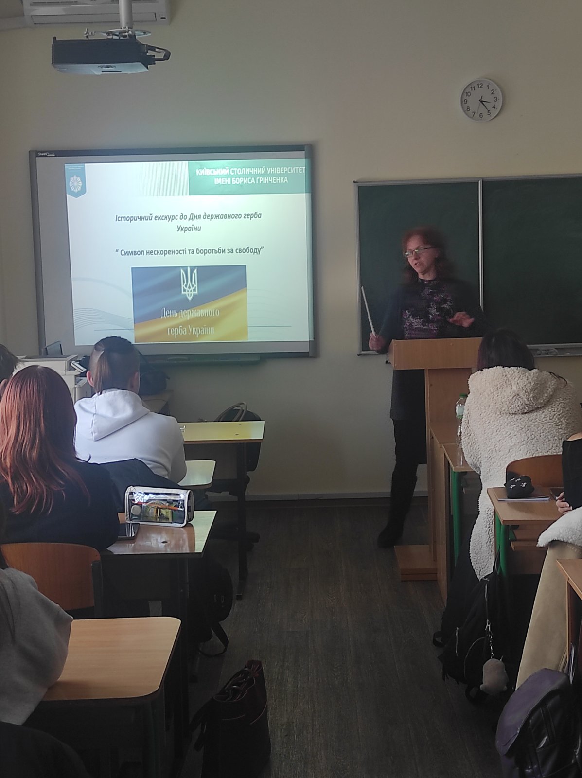 19 лютого 2025 року в рамках декади педагогічної майстерності циклової комісії суспільних дисциплін і правознавства Фахового коледжу "Універсум" викладач Юлія РЯБОКОНЬ в групах ОВфмб-1-23-3.5д та СПфмб-1-23-3.0д провела історичний екскурс до Дня державного герба України "Символ нескореності та боротьби за свободу". Студенти та викладачі мали можливість простежити еволюцію державного символу від часів Русі до сьогодення. Ознайомилися із зображенням Тризуба в інтерпретації Василя Кричевського, Георгія Нарбута, Павла Ковжуна, Андрія Гречила, Івана Турецького, Олексія Кохана та ін. Головним висновком для учасників заходу стало усвідомлення, що здавна Тризуб виступає як символ нескореності та боротьби українського народу за свободу. Цей символ є об'єднувальним елементом для українських патріотів, які віддано захищають наш суверенітет і територіальну цілісність України.