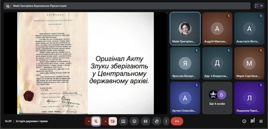 У ході лекції розглядалися правові аспекти документа, його політичне та міжнародне значення, а також виклики, що постали перед об'єднаною державою. Студенти аналізували історичні джерела, працювали в групах, дискутували щодо ролі соборності в сучасному конституційному процесі України, проводили паралелі між подіями початку ХХ століття та сьогоденням.