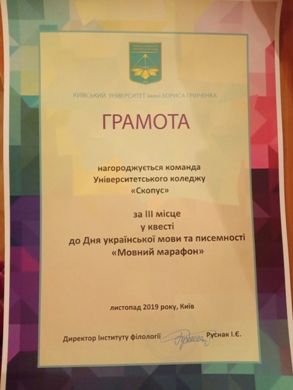 Квест «Мовний марафон» 14 листопада 2019 року грамотою з підписом директора Інституту філології І. Є. Руснак була нагороджена команда Університетського коледжу «Скопус» (група ВСмс- 17-4.0д) за ІІІ місце у квесті до Дня української писемності та мови «Мовний марафон».