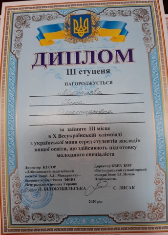 19 лютого 2020 року на базі Богуславського гуманітарного коледжу ім. І.С. Нечуя-Левицького відбувся ІІ (регіональний) етап X Всеукраїнської олімпіади з української мови серед студентів педагогічних ЗВО/ЗФПО Центрального регіону України. За результатами виконання конкурсних завдань Олімпіади диплом ІІІ ступеня здобула Михалева Інна Олександрівна, студентка ІІ курсу, групи ПОмс-1-18-4.0д.