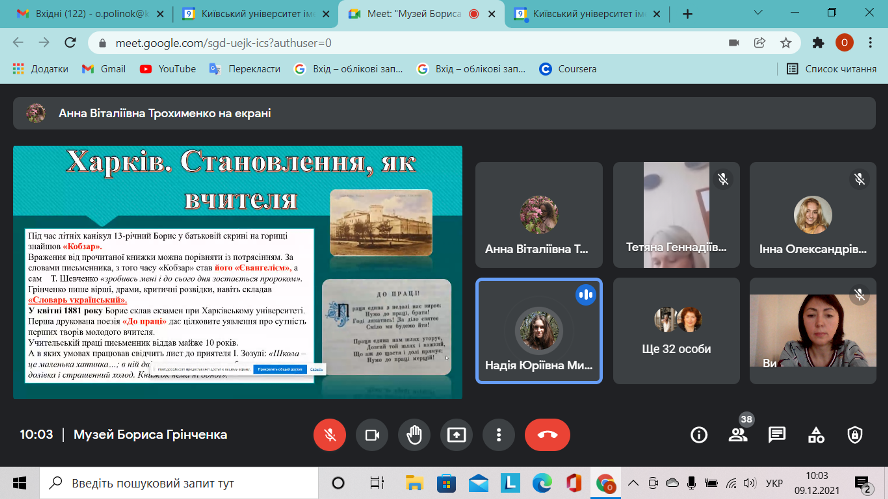 Метою проведення зустрічі було ознайомлення з різними періодами життєвого й творчого шляху Бориса Дмитровича Грінченка, плекання бажання читати твори митця та популяризувати його спадщину. Студенти в онлайновому форматі провели змістовну екскурсію, презентували мініпроєкти. Студентка 4 курсу спеціальності «Початкова освіта» Михалева Інна прочитала власну поезію. До зустрічі долучився старший науковий співробітник Музею Бориса Грінченка Михайло Васильович Лашко, який поділився зі студентами результатами наукових розвідок про життя та смерть Бориса Грінченка.