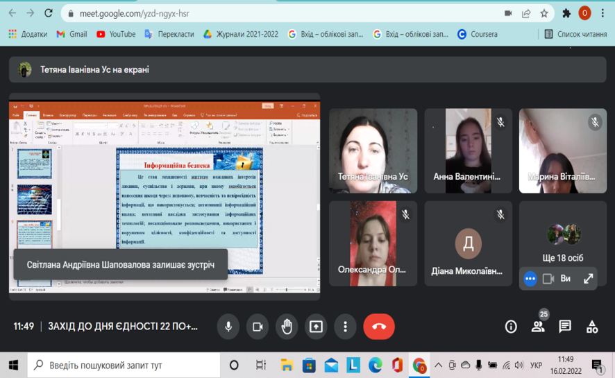 16.02.2022 р. для груп ПОфмб-2-20-4.0д та ДОмс-1-19-3.0д проведено виховну годину «Сучасні інформаційні війни в інтернет-просторі» (на тлі загострення відносин між Росією і Україною), присвячену Дню єднання. На заході розглянуто й проаналізовано форми сучасних інформаційних війн, а саме створення країною-агресором атмосфери бездуховності й аморальності, негативного ставлення до культурної спадщини нашої країни; маніпулювання суспільною свідомістю соціальних груп населення країни з метою створення політичної напруженості та хаосу; дезінформація населення про роботу державних органів та ін.