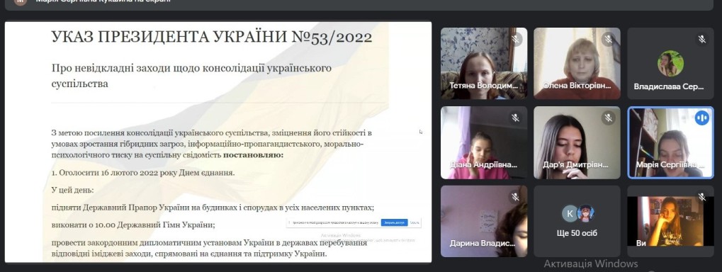 16.02.2022 р. у Фаховому коледжі «Універсум» Київського університету імені Бориса Грінченка з нагоди проведення Дня єднання України відбулася виховна година «Всі ми єдині, бо в нас Батьківщина одна» для студентів І-ІІІ курсів спеціальності «Журналістика». Студенти ознайомилися з указом Президента України Про невідкладні заходи щодо консолідації українського суспільства, історією свята у країнах світу, переглянули церемонію підняття Державного Прапора України у Фаховому коледжі «Універсум», виконали гімн.