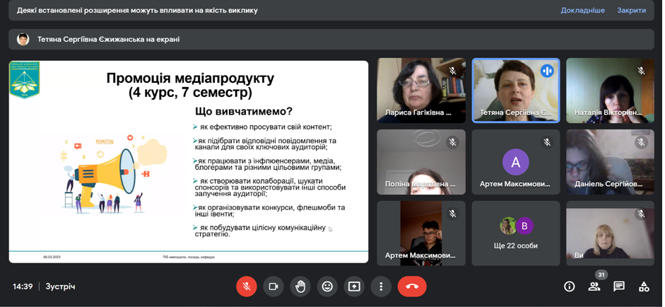 09.03.2023 року відбулася зустріч студентів ІІІ та ІV курсів спеціальності «Журналістика» Фахового коледжу «Універсум» із завідувачем кафедри медіапродюсування та видавничої справи Факультету журналістики Київського університету імені Бориса Грінченка Масімовою Ларисою Гагіківною та викладачем Єжижанською Тетяною Сергіївною.