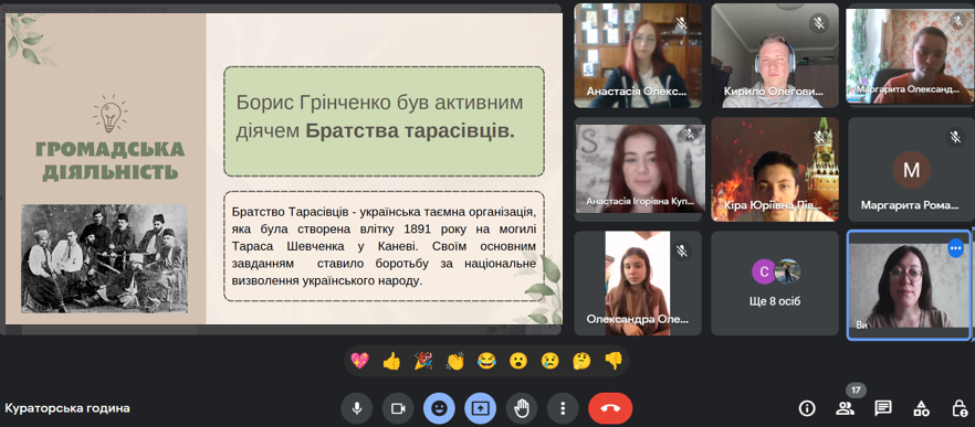 05 травня 2023 року відбулася кураторська година, присвячена вшануванню пам’яті Бориса Грінченка. Студенти групи ВСфмб-1-22-4.0д в ігровій формі пригадали основні віхи життя Бориса Грінченка, його досягнення у письменницькій, лексикографічній, видавничій, педагогічній діяльності. Також учасники заходу зосередили увагу на патріотичних поглядах Бориса Грінченка та його внеску в розвиток української культури.