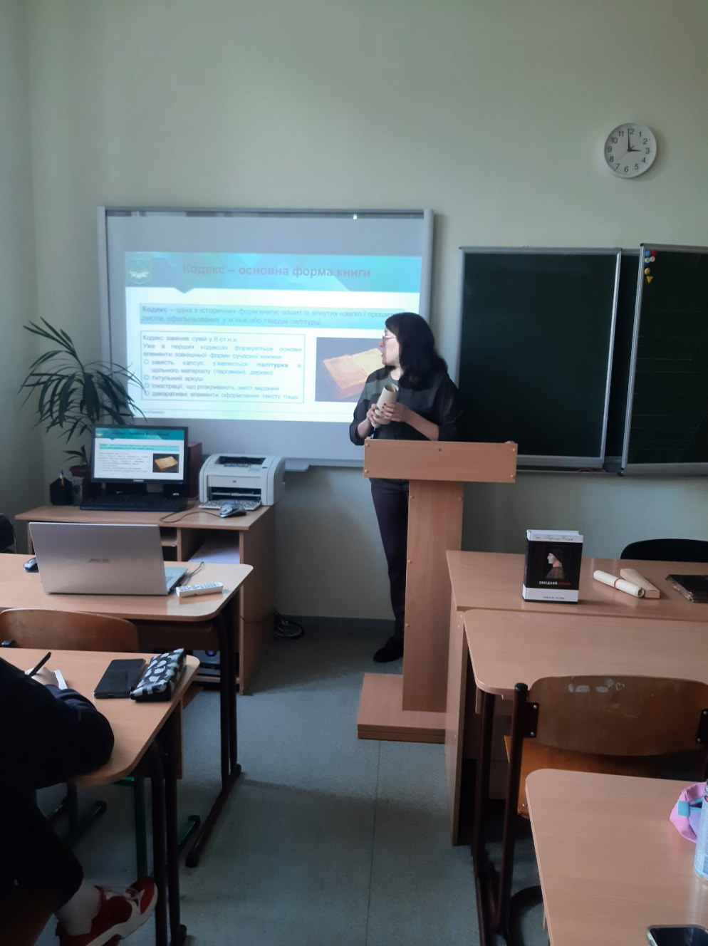 Наочність забезпечувалася зразками книг у формі кодексу, макетами сувоїв та мультимедійною презентацією. Студенти та викладачі взяли участь в обговоренні переваг книги у формі кодексу над сувоєм, розглянули етапи виробництва паперу за європейською технологією, особливості зовнішньої та внутрішньої форми книги, традиції декоративного оздоблення рукописів.