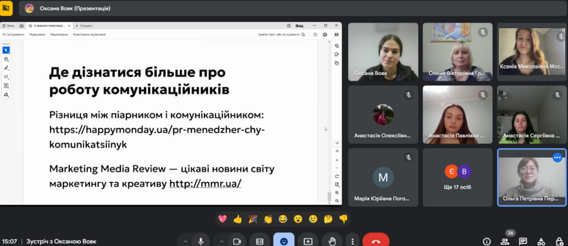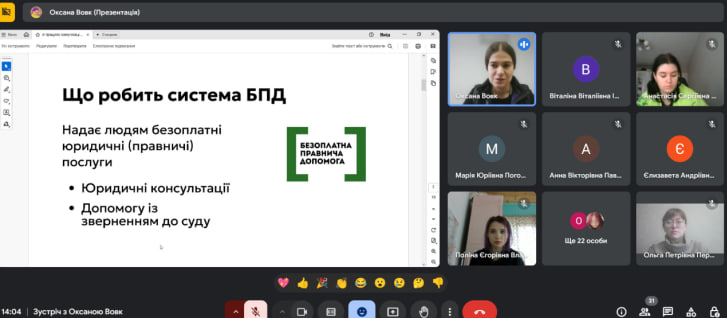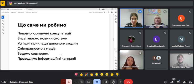 25 жовтня 2024 року відбулася зустріч студентів спеціальностей Журналістика та Право з начальницею відділу інформаційної політики та комунікацій Координаційного центру з надання правничої допомоги Оксаною Вовк. Спікерка розповіла про специфіку роботи у сфері комунікацій, важливість донесення цільовій аудиторії складної інформації простими словами та поділилася корисними покликаннями для розвитку у професії. Також учасники заходу проаналізували вдалі й невдалі приклади відомих комунікаційних кампаній.
