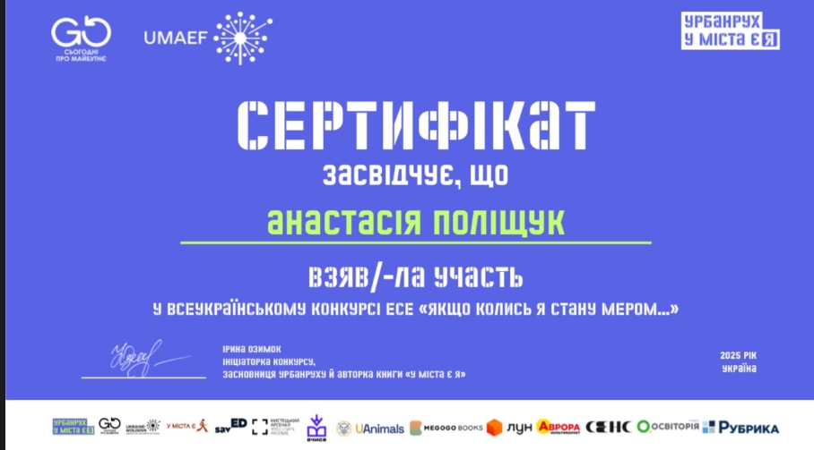 9 грудня 2025 року були оголошені результати Всеукраїнського конкурсу есе «Якщо колись я стану мером...». Студенти 1 та 2 курсу Фахового коледжу «Універсум» спеціальностей «Організація виробництва» (Поліщук Анастасія, Кузнецова Катерина) та "Початкова освіта" (Ященко Марія, Хлопова Марія), які з 15 жовтня до 15 листопада подали свої роботи на конкурс, який був ініційований неформальною освітньою програмою «Урбанрух "У міста є Я"». Мета конкурсу: стимулювання роздумів української молоді щодо потреб та викликів своїх населених пунктів, формулювання ідей та рішень підлітками. Студенти отримали сертифікати учасників. Дякуємо за долучення до конкурсу есе і небайдужість до життя Вашого міста, села чи громади.