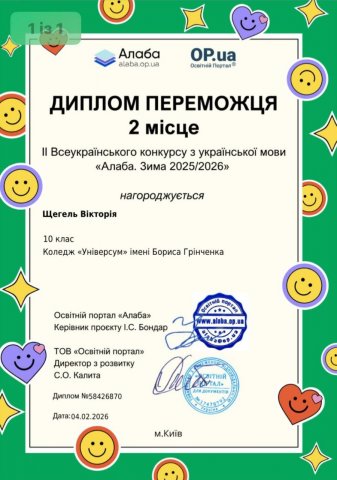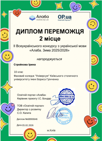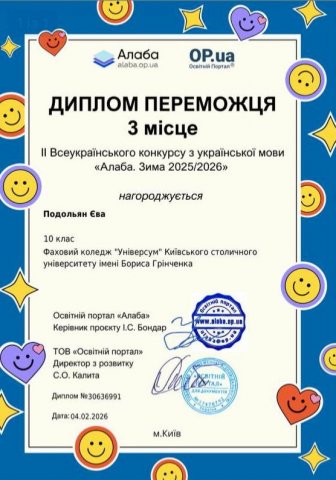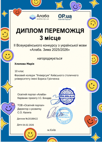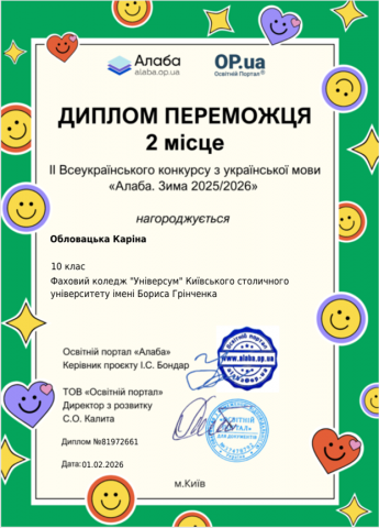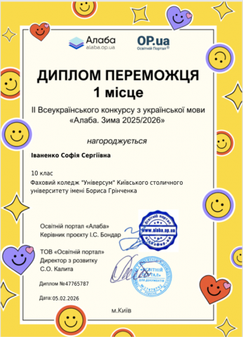 У лютому 2026 року студенти Фахового коледжу «Універсум» спеціальності "Початкова освіта" брали участь у ІІ Всеукраїнському конкурсі з української мови «Алаба. Зима 2025/2026», організований освітнім порталом «Алаба» за підтримки ТОВ «Освітній портал», який проходив у дистанційному форматі.